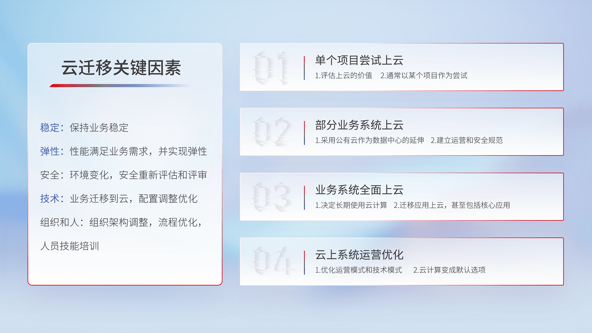 结合实际业务,,,,从规划设计、、、、云平台选型、、、云原生改造、、数据迁移、、、、集成交付,,迁移全过程为客户识别最佳上云路径,,,,做好风险识别管理,,,,设计网络架构、、、、身份权限、、、安全审计合规、、、操作审计、、、、日志审计、、监控告警策略、、多站点容灾设计等,,,,对云上基础设施进行整体规划,,,提升IT治理水平,,,,以满足弹性、、高可用、、、、高性能的需求。。
