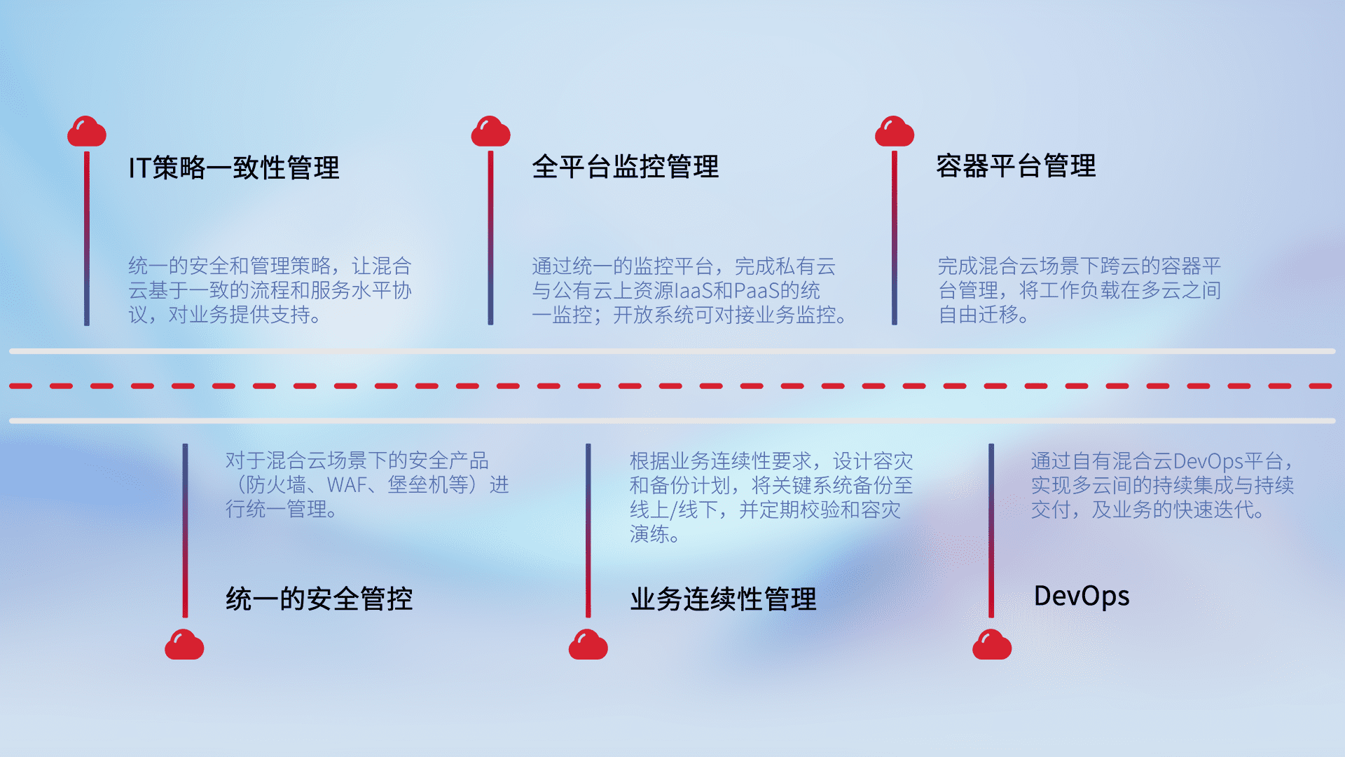 通过多云纳管,,,,以统一的资源数据模型把客户的云资源进行抽象和封装,,,进而实现对多云资源的统一操作,,,,保障云资源管理的可靠性、、、稳定性与可用性。。。。量身定制化运维内容,,,,配置、、、开发运维、、、、补丁管理、、、备份、、监控、、认证和访问管理、、、、审计和日常巡检等,,保障在用云过程中的可靠度,,稳定度以及高可用率。。。