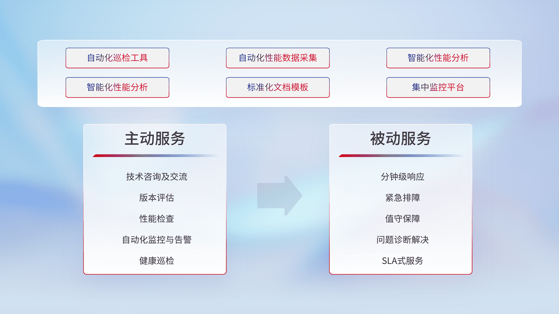 智能化工具和标准化文档,,,,保障服务质量,,提供主动服务(包含技术咨询、、版本评估、、、、性能检查、、自动化监控与告警、、健康巡检)和被动服务包含(分钟级响应、、、、紧急排障、、、、值守保障、、、问题诊断解决、、、、SLA服务)。。。。